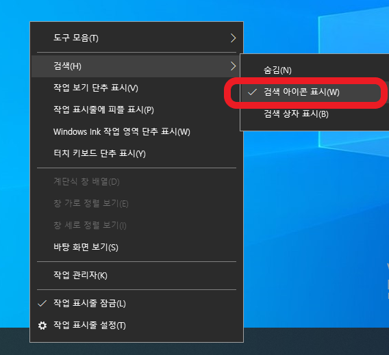3. 창 상단에 검색을 클릭해 줍니다. 그러면 숨김으로 표시된 것을 검색 아이콘 표시로 클릭해 줍니다. 그러면 바탕화면 왼쪽 하단에 돋보기 모양이 생깁니다.