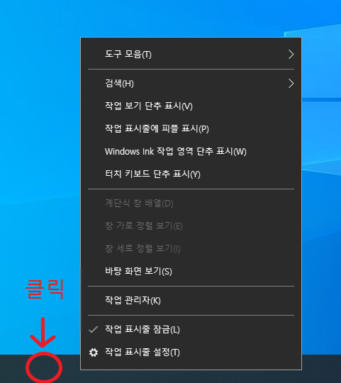 2. 바탕화면 맨밑 검은색 하단을 마우스 오른쪽으로 클릭해 줍니다. 그러면 검은 창이 열립니다.