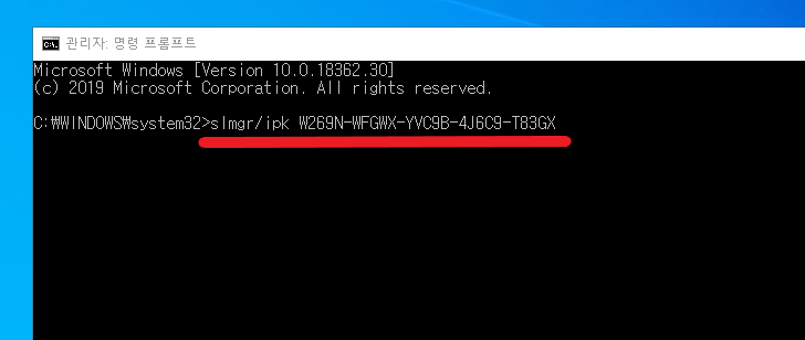 6. 관리자 명령 프롬프트 창이 나오고 거기에 slmgr/ipk W269N-WFGWX-YVC9B-4J6C9-T83GX 라고 입력하고 엔터를 눌러 줍니다.