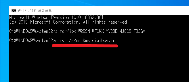 7. 그 다음 slmgr /skms kms.digiboy.ir 를 입력해 엔터를 눌러 줍니다.