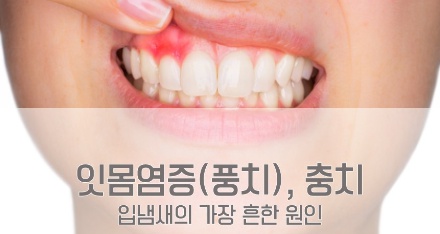 2. 충치나 이빨 사이에 음식물이 끼면 냄새를 일으키며 입속에 잇몸질환이나 보철물, 충치, 틀니 등이 입냄새 원인이라고 합니다.