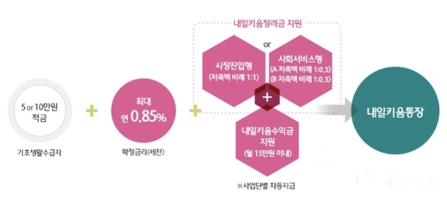 희망키움통장과 내일키움통장은 본인이 일정하게 저축한 금액에 추가로 지원하여 목돈을 마련할수 있게 도와주며 2~3년내 기초생활 수급자 신분에서 벗어나지 못할 경우 적립액은 지급되지 않고 국고로 환수 됩니다.
