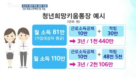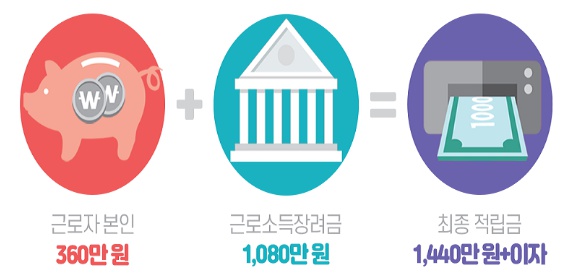저축 금액은 월 10만원이며 3년간 근로활동을 지속하고 교육이수 및 국가공인 자격증 취득을 하면 근로소득장려금 1080만원을 지원하며 3년 기준 평균 1440만원이 적립됩니다.