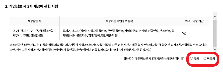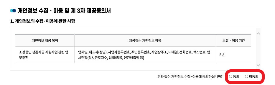 7. 신청전 개인정보 제공동의서를 꼼꼼히 읽어보시고 각각 동의를 클릭해주며 내려갑니다.