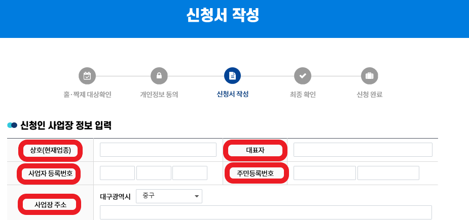 9. 이제 신청서 작성이 나오며 신청인 사업장 정보 입력을 위해 상호, 대표자, 사업자 등록번호, 주민등록번호, 사업장 주소를 입력해 줍니다.