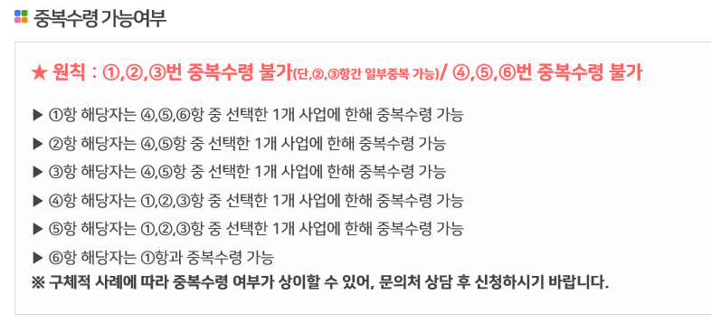 4. 우선 정책 마지막 하단에 중복수령가능 여부를 읽어 보시고 신청을 해야겠습니다.