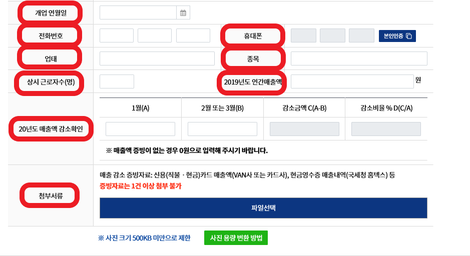 10. 개업 연월일, 전화번호, 휴대폰, 업태, 종목, 상시근로자수, 2019년 연간 매출액, 20년도 매출액 감소확인, 첨부서류(증빙자료)를 첨부해 주시면 됩니다.