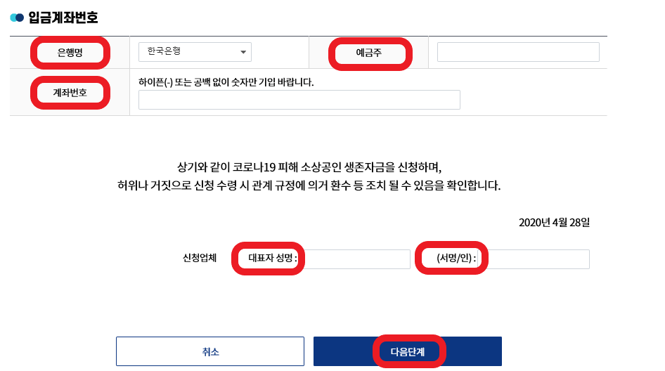 11. 그리고 중요한 입금계좌번호를 입력해주고 서명, 서명인을 정확히 입력하고 다음단계로 클릭해 줍니다.