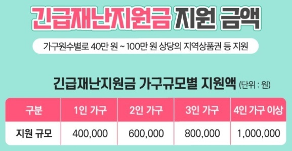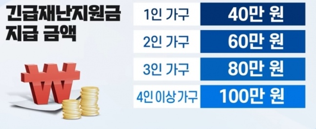 지원금 금액은 1인가구 40만원 / 2인가구 60만원 / 3인가구 80만원 / 4인가구 100만원 입니다.