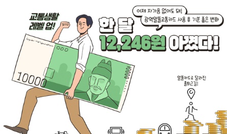 광역 알뜰교통카드란 광역 알뜰교통카드로 대중교통을 이용하면 교통요금을 10% 할인을 받을수 있으며 걷거나 자전거로 이동한 거리만큼 마일리지가 20% 적립되어 대충교통비를 최대 30% 까지 절감할수 있습니다.