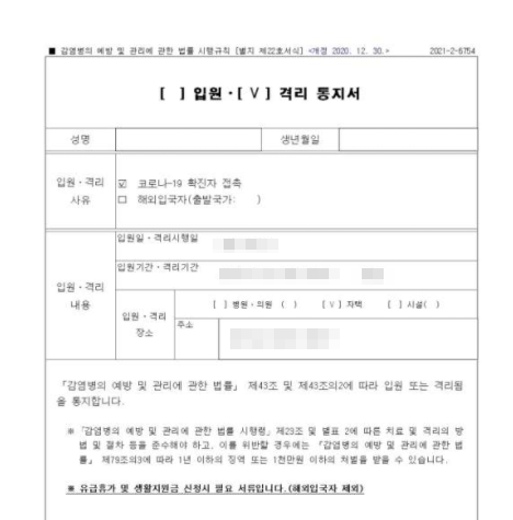 코로나 자가격리 통지서 발급