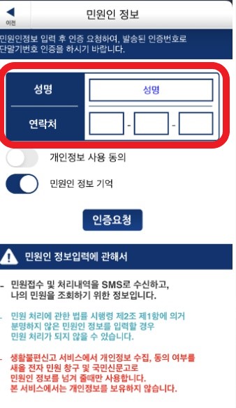 2. 설치가 끝나면 앱을 실행해 민원인 정보를 입력 합니다.