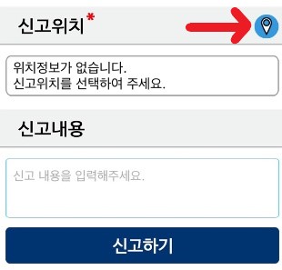 6. 신고 위치와 신고 내용을 적어 주셔야하는데 신고 위치를 모르실 경우 오른쪽에 파란원 모양을 클릭해주면 현재위치GPS 재수신, 도로명 검색, 지역검색 등으로 위치를 찾을수 있으며 신고 내용은 누구나 쉽게 이해하도록 적어주시고 신고하기를 누르면 완료됩니다.