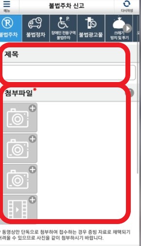 5. 작성은 제목 및 첨부파일에 찍은 사진을 첨부해 주시고 하단으로 내리면 신고 위치 및 신고 내용이 보입니다.