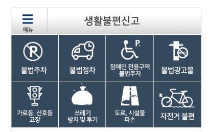 4. 그리고 신고 메뉴중에 불법주차, 불법정차, 장애인 전용구역 불법주차, 불법광고물, 쓰레기 방치 및 투기, 가로등 신호등 고장, 도로 시설물 파손 등등 자신이 불편함을 겪고 있는 항목으로 가셔서 내용을 작성 해주셔야 합니다.